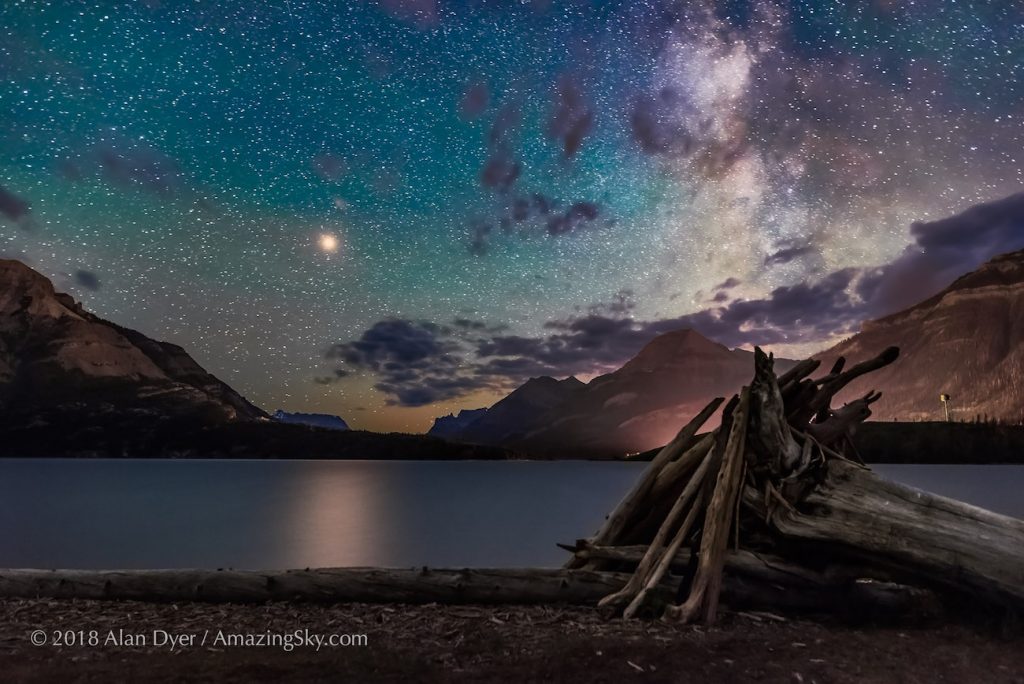 Imagen de Marte y la Vía Láctea captados sobre el lago Waterton en la provincia de Alberta, Canadá, la noche del jueves (12 de julio de 2018). La imagen está compuesta por 10 fotografías apiladas (del paisaje); y una fotografía del cielo. Cada una de las 11 fotos tienen un tiempo de exposición de 30 segundos y 6400 de ISO; se usó una cámara Nikon D750.