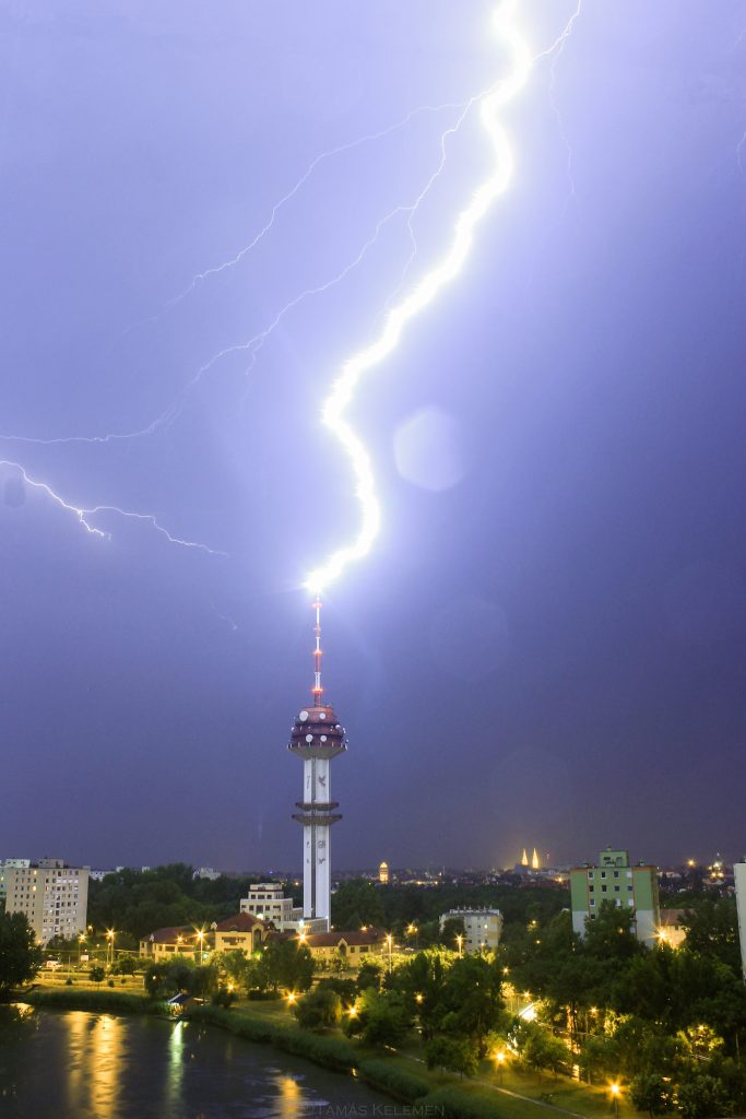 Impresionante fotografía de un rayo impactando una torre durante una tormenta eléctrica en la ciudad de Szeged, Hungría. La captura se obtuvo la noche del domingo, 25 de junio de 2017, con una cámara Canon 1300D y un objetivo Canon (distancia focal de 18mm). Tiene un tiempo de exposición de 10 segundos y 100 de ISO.