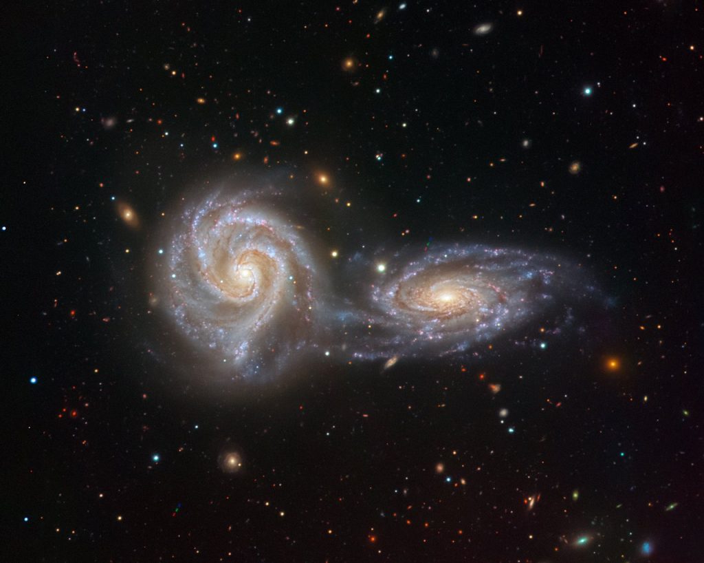 En esta imagen captada por el instrumento VIMOS, instalado en el VLT (Very Large Telescope) de ESO, vemos dos galaxias espirales atrapadas en una fascinante y arremolinada danza. Las dos galaxias en interacción, NGC 5426 y NGC 542, forman un intrigante objeto astronómico llamado Arp 271.