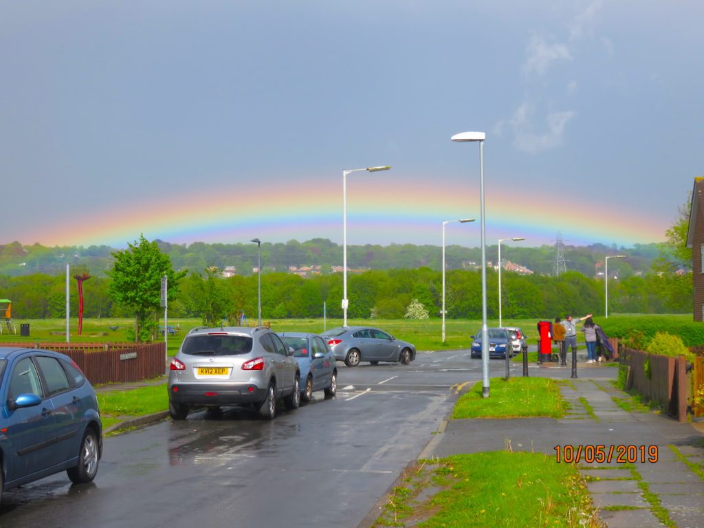 Fotografía de un arcoíris tomada la tarde del viernes, 10 de mayo de 2019, desde Wirral, Merseyside, Inglaterra. Se utilizó una cámara Canon PowerShot SX700 HS; la captura tiene un tiempo de exposición de 1/800 de segundo, 100 de ISO y f/4 de apertura.
