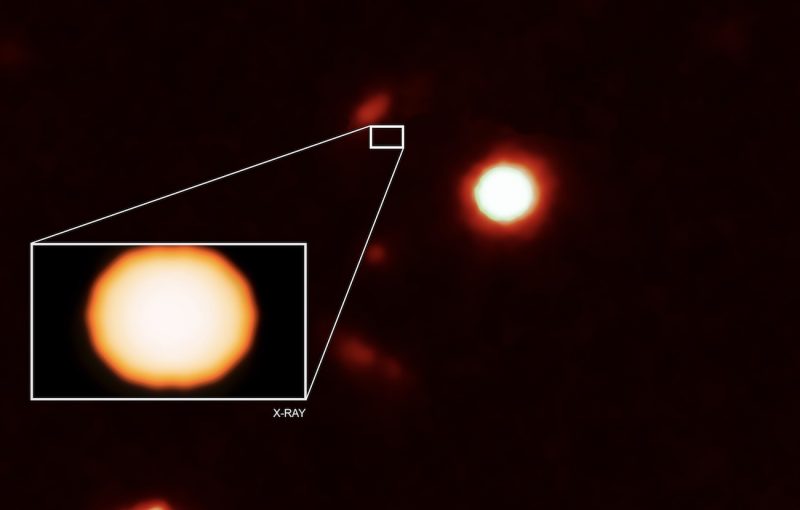 Esta imagen, obtenida por el Observatorio Chandra de rayos-X de la NASA, muestra la ubicación de una poderosa emisión de rayos-X, denominada XT2. Los astrónomos piensan que la emisión fue producida por la fusión de dos estrellas de neutrones.
