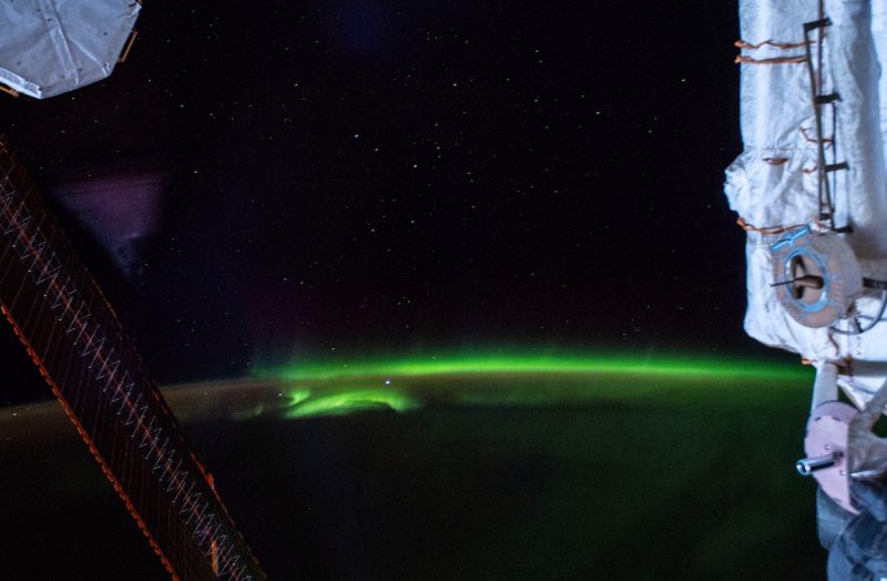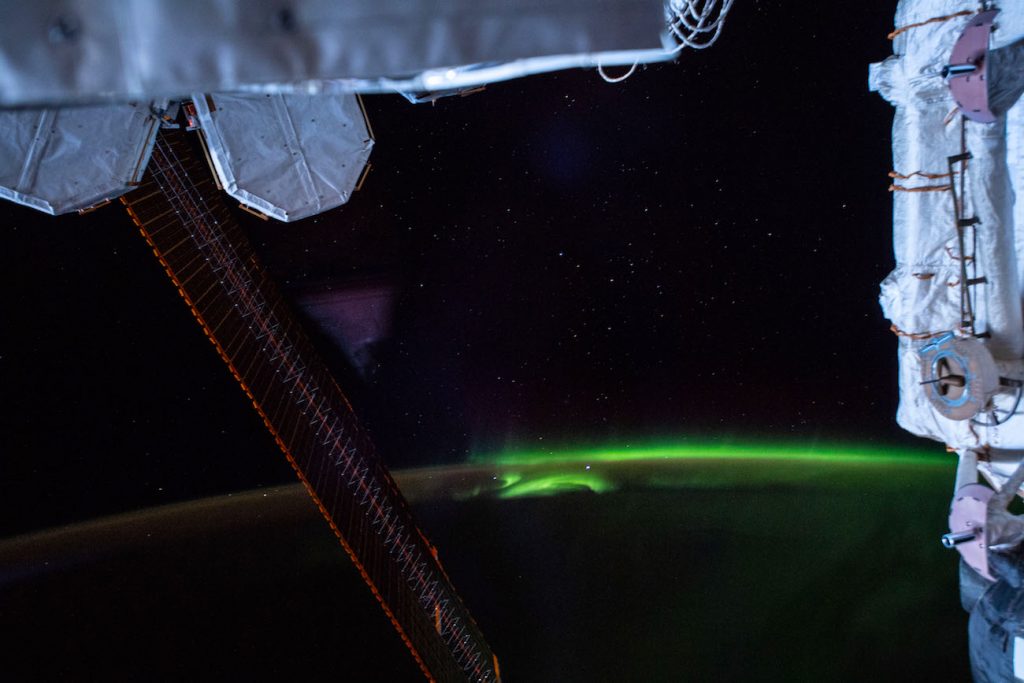 Fotografía de auroras australes captadas desde la Estación Espacial Internacional el 4 de abril de 2019, a las 21:50 UTC. Se utilizó una cámara Nikon D5 a 25mm de distancia focal; al momento de tomarse la imagen, la ISS se encontraba sobre el sur del océano Índico, al sur de los Territorios Australes Franceses.