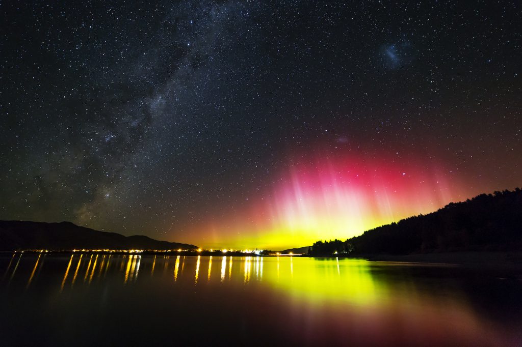 Espectacular fotografía de auroras australes y la Vía Láctea tomada desde el Lago Hawea (Otago, isla Sur) en Nueva Zelanda. También se puede ver la Gran Nube de Magallanes en la zona superior-derecha; la Pequeña Nube de Magallanes está ubicada justo arriba de la cortina de auroras. La captura tiene 4000 de ISO y un tiempo de exposición de 15 segundos; se utilizó una cámara Canon EOS 6D.