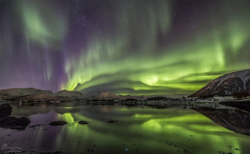 Estupenda imagen tomada la noche del 7 de febrero de 2016 en Andøy, Noruega. Muestra a una cortina brillante de auroras boreales reflejándose en un lago cerca de Buksnesfjord, en el municipio de Andøy, el cual pertenece al condado de Nordland (archipiélago de Vesterålen). La imagen fue tomada con una cámara Canon EOS 5D Mark III; tiene 10 segundos de tiempo de exposición y 2500 de ISO.
