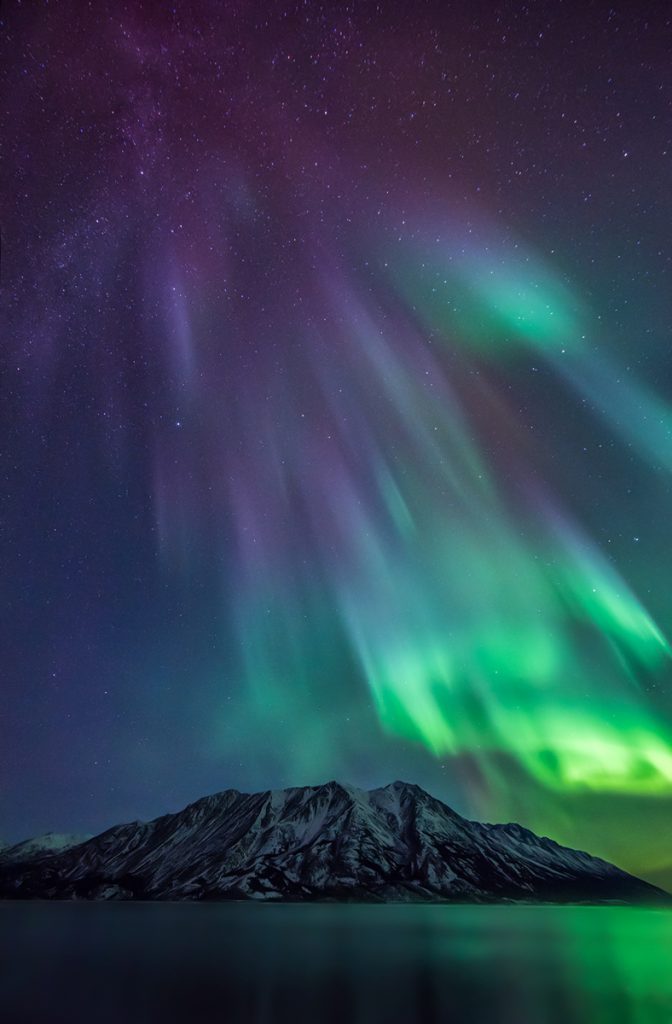 Fotografía de auroras boreales tomada el 30 de marzo de 2017 desde Whitehorse en el territorio del Yukón (noroeste de Canadá). En la zona superior-izquierda se puede ver una parte de la Vía Láctea. El tiempo de exposición de la captura es de 8 segundos y 3200 de ISO; se utilizó una cámara Canon EOS 5D Mark III.