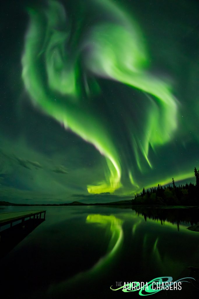 Impresionante captura de auroras boreales brillando sobre un lago en Fairbanks (centro del estado de Alaska), Estados Unidos. La fotografía se tomó la madrugada del miércoles, 13 de septiembre de 2017, con una cámara Canon EOS 5D Mark II; tiene 1600 de ISO y un tiempo de exposición de 5 segundos.