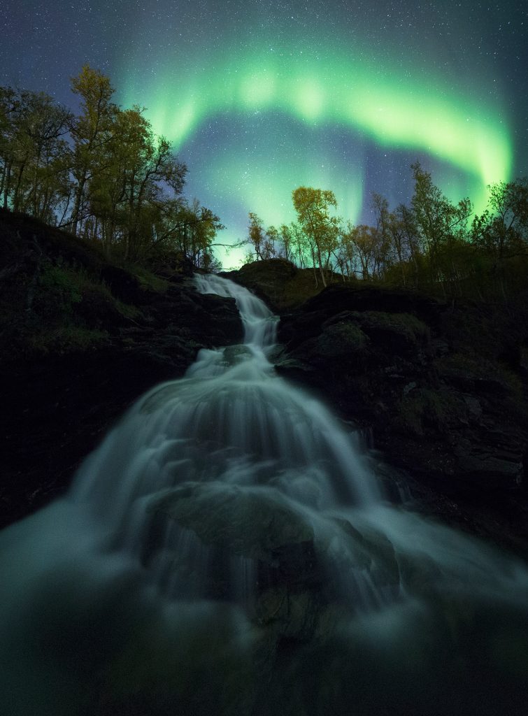 Excelente imagen de auroras boreales captadas desde la provincia de Troms (norte de Noruega) la noche del domingo, 24 de septiembre de 2017. La imagen es un mosaico de tres fotografías de 6400 de ISO y 20 segundos de tiempo de exposición cada una. Se usó una cámara Canon EOS 6D.