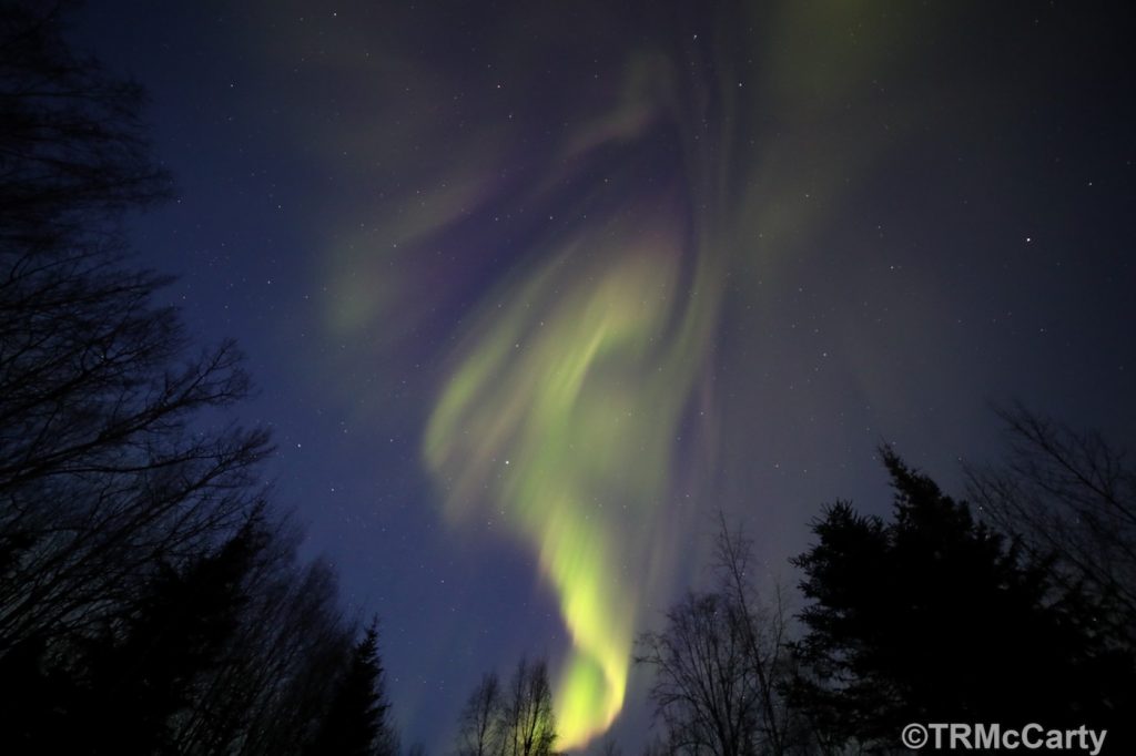 Auroras boreales fotografiadas la noche del viernes, 26 de abril de 2019, desde Fairbanks en Alaska, Estados Unidos. Se utilizó una cámara Canon EOS 5D Mark IV y un objetivo ojo de pez (8mm). El tiempo de exposición de la captura es de 2 segundos y 3200 de ISO.