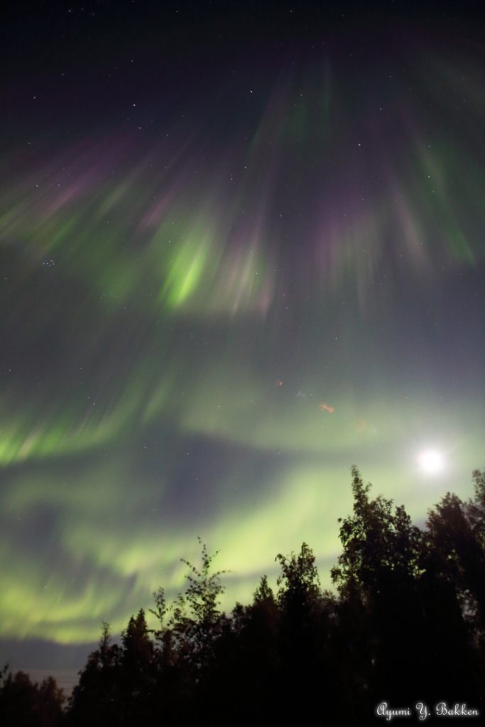 Auroras boreales y la Luna brillan sobre Fairbanks en el estado de Alaska, Estados Unidos, en esta fotografía tomada la madrugada del 8 de septiembre de 2017. La captura tiene 3200 de ISO y 1 segundo de tiempo de exposición (f/3,2). Se usó una cámara Canon EOS 5D Mark III.