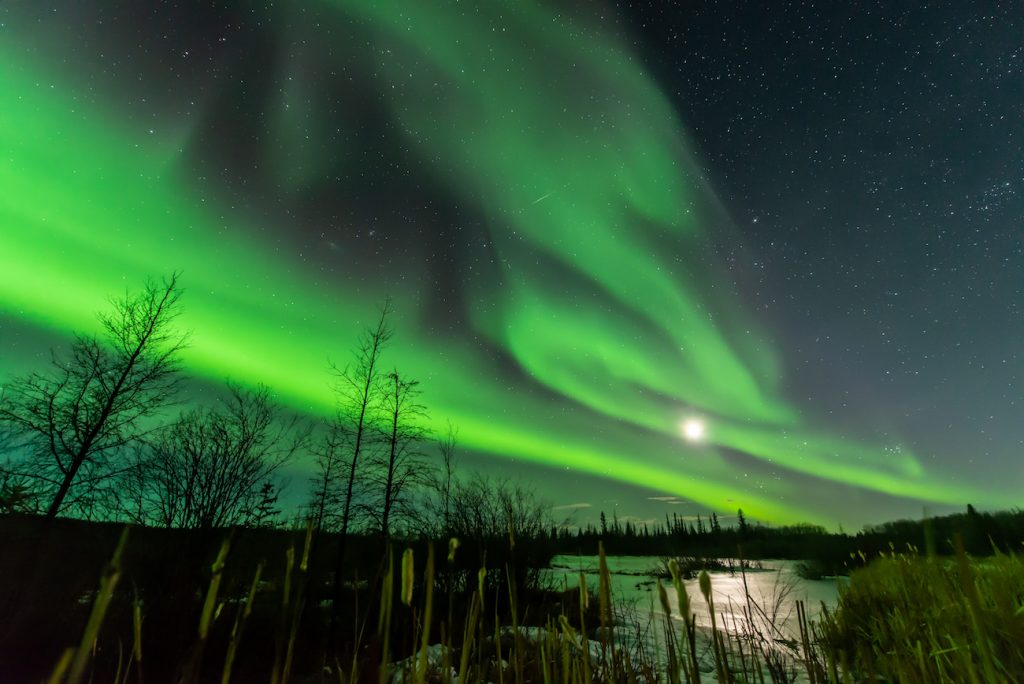 Excelente fotografía de la Luna y auroras boreales tomada la noche del 10 de abril de 2019, a las 23:46 (hora local) cerca de Fort Smith en Territorios del Noroeste, Canadá. La imagen fue obtenida con una cámara Nikon D800E a 10 segundos de tiempo de exposición y 3200 de ISO (f/2,8 de apertura).