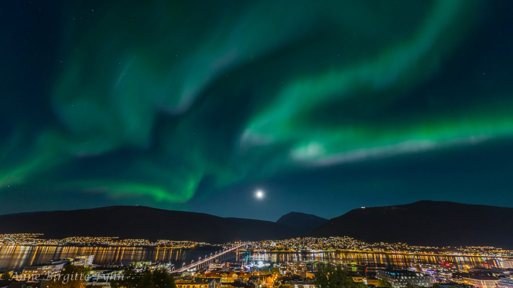 Fotografía de auroras boreales y la Luna brillando sobre la ciudad de Tromsø, Noruega. Fue tomada la noche del viernes, 8 de septiembre de 2017, con una cámara Nikon D610 y un objetivo Nikkor (14mm – f/2,8). La foto tiene un tiempo de exposición de 1/3 segundos y 1600 de ISO.