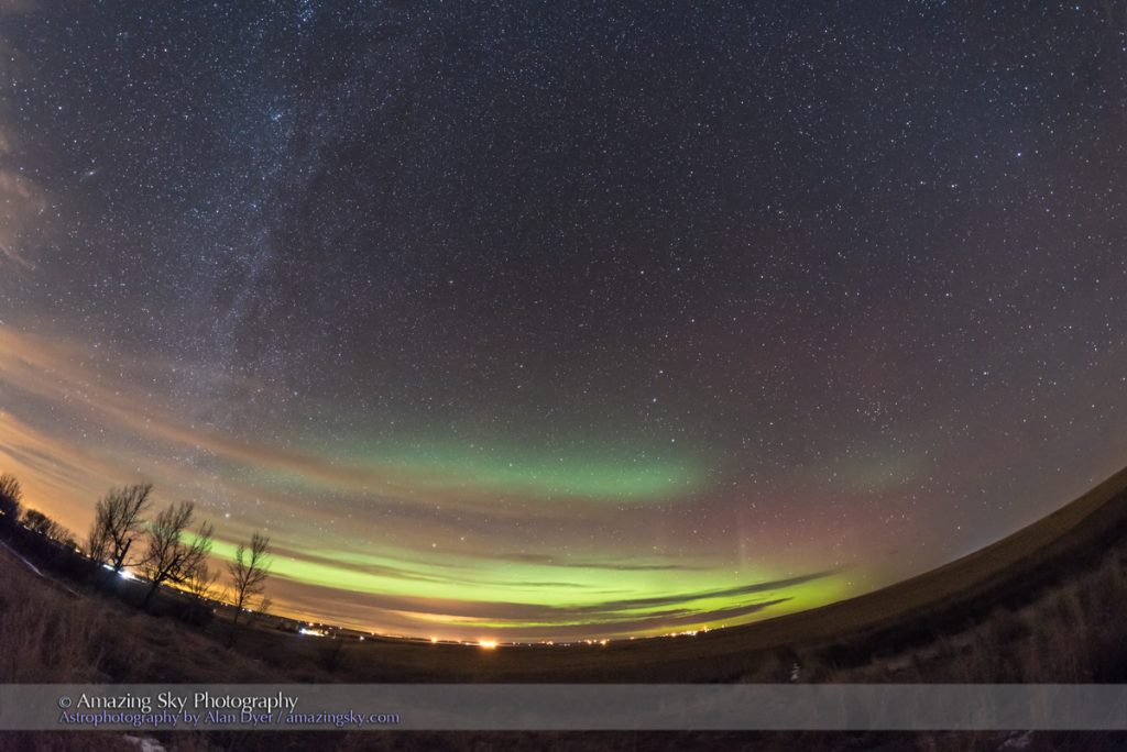 Fotografía de auroras boreales tomada la noche del viernes, 17 de febrero de 2017, desde Gleichen en la provincia de Alberta, Canadá. Recorriendo verticalmente la zona izquierda la imagen, se puede apreciar a la Vía Láctea. Se utilizó una cámara Nikon D750 y un objetivo ojo de pez (12mm); el tiempo de exposición es de 20 segundos y 3200 de ISO.