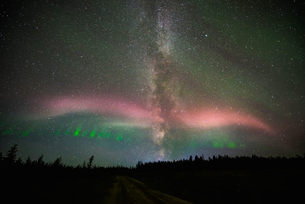 Fotografía de varias cortinas de auroras boreales cruzando la Vía Láctea la madrugada del viernes, 15 de septiembre de 2017, en Kakwa (provincia de Alberta, Canadá). La captura tiene 25 segundos de tiempo de exposición y 1600 de ISO; se utilizó una cámara Nikon D800 y un objetivo Nikkor (14mm – f/2,8).