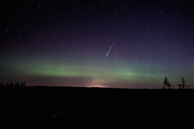 Un meteoro cruza el cielo iluminado por las auroras boreales en Kakwa, provincia de Alberta, Canadá. La fotografía fue tomada la madrugada del 14 de septiembre de 2017 (02:05 – hora local), con una cámara Nikon D800 y un objetivo Nikkor (14-24mm – f/2,8). El tiempo de exposición de la captura es de 6 segundos y 3200 de ISO.