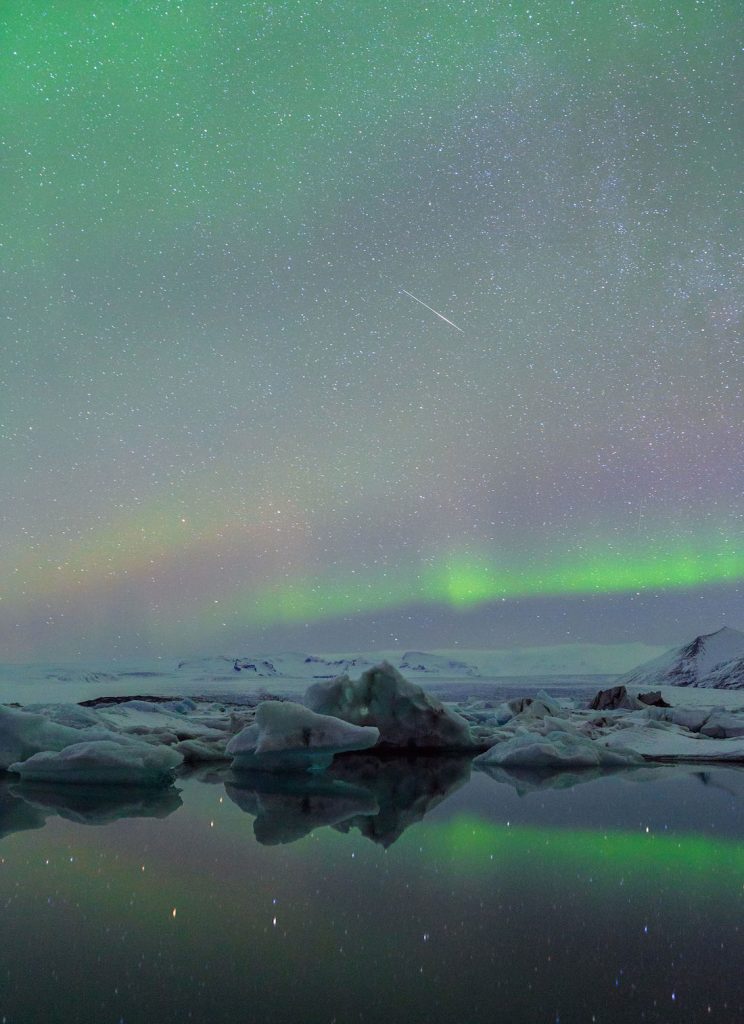En esta fotografía se puede ver un meteoro cruzando el cielo cubierto de estrellas y auroras boreales en Jökulsárlón, Islandia. La captura se hizo la noche del miércoles, 1 de marzo de 2017, con una cámara Canon EOS 6D; el tiempo de exposición es de 20 segundos y 3200 de ISO.