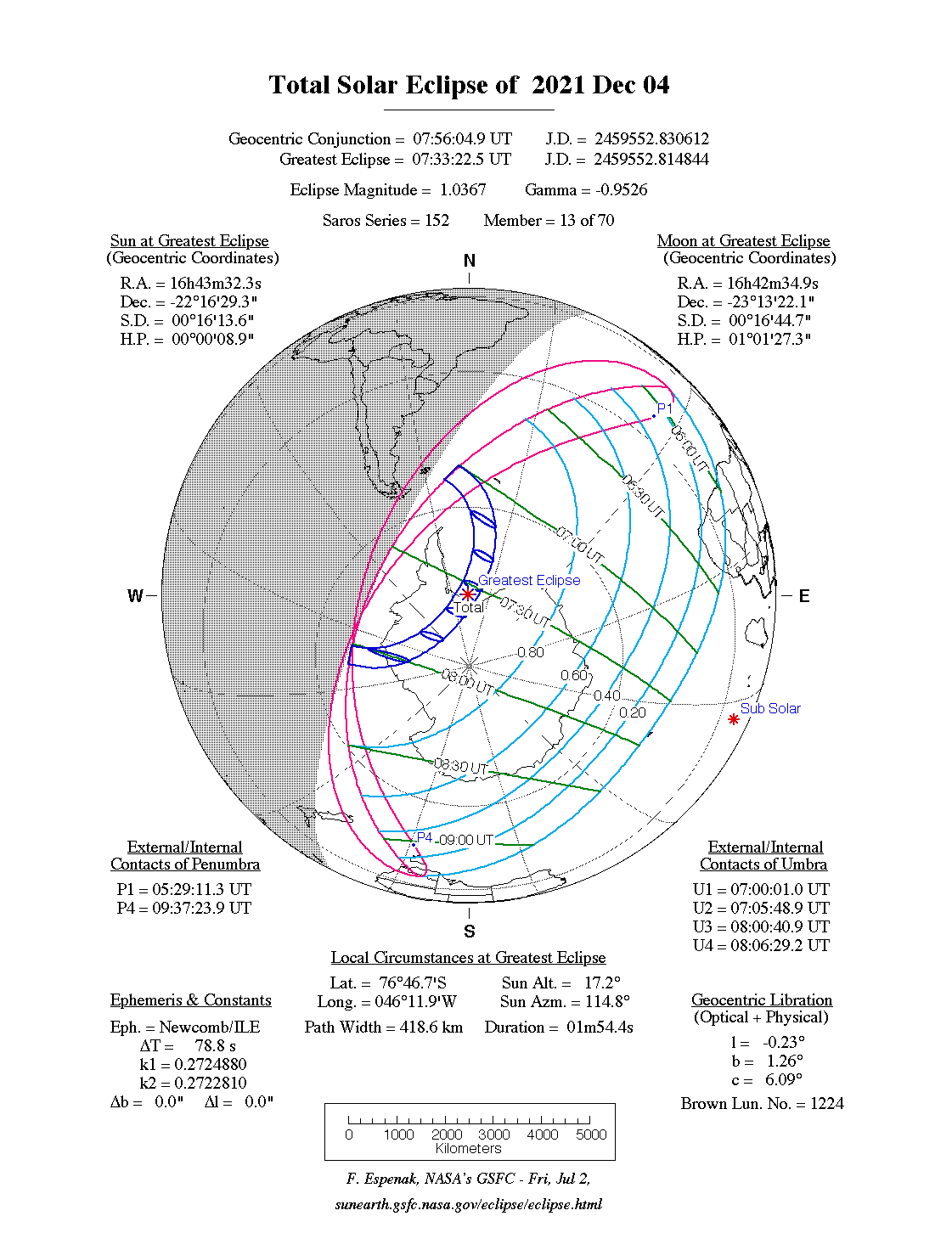 4 Eclipse total de Sol. Contacto inicial de la penumbra a las 05:29 UTC; contacto final a las 09:37 UTC. Contacto inicial de la umbra las 07:00 UTC; contacto final a las 08:06 UTC. Fase máxima de la fase total a las 07:33 UTC. La fase total será visible desde la Antártida. La fase parcial se podrá observar desde el sur de África y una pequeña región del sur de Australia. Ver mapa