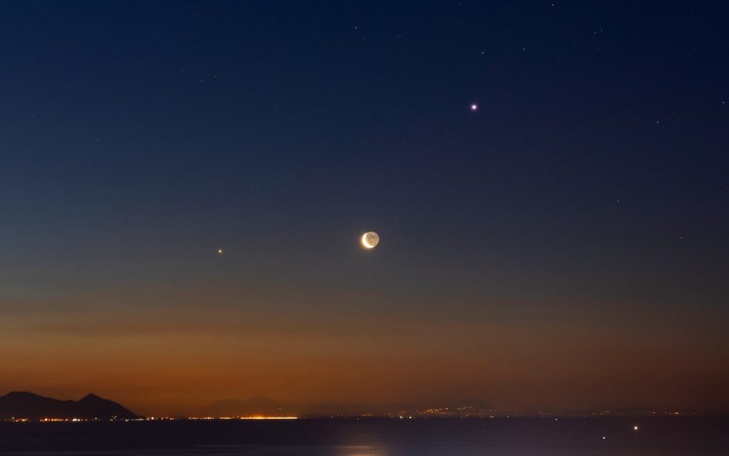9         Conjunción de la Luna y los planetas Júpiter y Saturno. Visible durante la madrugada del día 9, comenzando en dirección Sureste después de la medianoche. La máxima aproximación entre la Luna y Júpiter se producirá a las 19:00 UTC (día 8); entre la Luna y Saturno a las 04:00 UTC. Magnitudes: Júpiter -2,6; Saturno +0,4. Ver imagen.