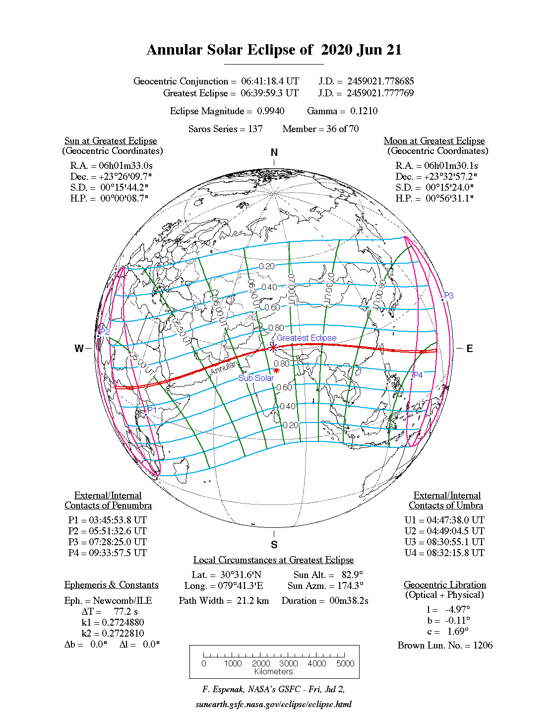 21       Eclipse anular de Sol, visible desde las 04:48 a las 08:32 UTC. Fase máxima a las 06:40. El estrecho sendero de la anularidad se extenderá desde el centro de África hasta el sur de Asia, China y el Pacífico. La fase parcial se podrá ver desde África, Europa Oriental y Asia. Ver mapa.
