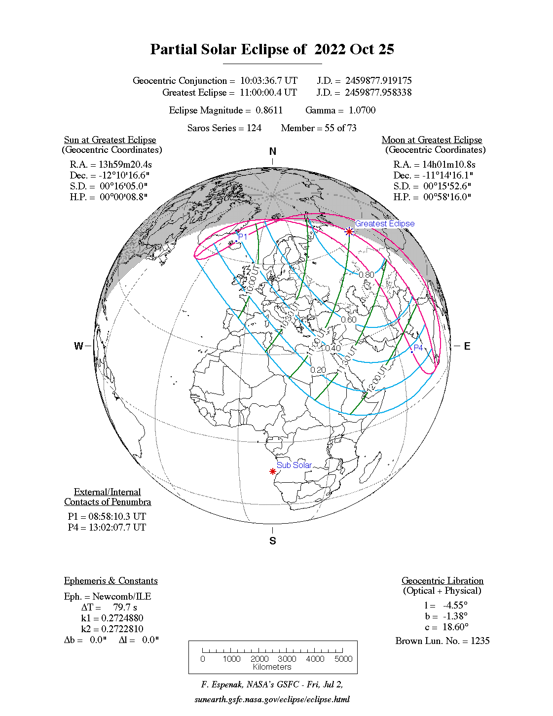 25        Eclipse Parcial de Sol a las 11:00 UTC (fase máxima). Visible desde Europa, el nordeste de África, el Medio Este y Asia Oriental. Inicia a las 08:58 UTC y concluye a las 13:02 UTC. Ver mapa