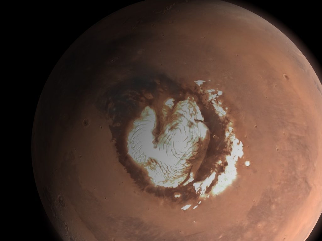 Un grupo de científicos, de la Universidad de Texas en Austin, ha anunciado el descubrimiento de varias capas de hielo enterradas a casi 2 kilómetros debajo del polo norte de Marte, en lo que podría ser la tercera reserva de agua más grande que se conoce en el planeta.