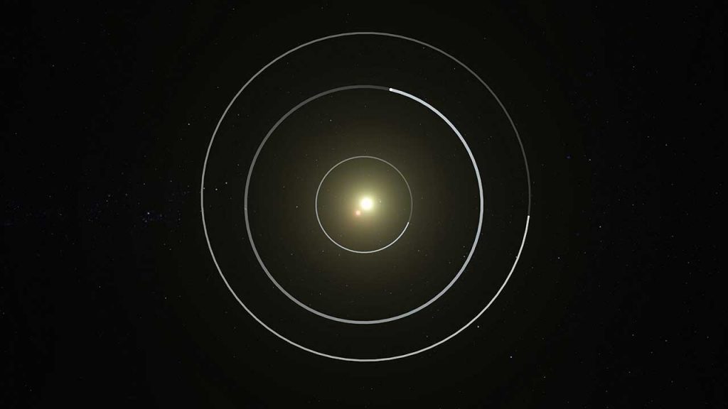El sistema binario Kepler-47 se encuentra a una distancia de 3.340 años luz de la Tierra, en la constelación de Cygnus. Una de las estrellas es similar al Sol y la otra tiene 1/3 de la masa de nuestra estrella (entre ellas completan una órbita cada 7,45 días). Todo el sistema es tan compacto que cabría dentro de la órbita de la Tierra.