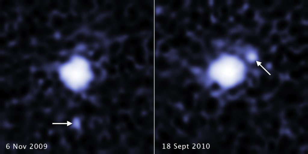 Estas dos imágenes, tomadas con un año de diferencia, revelan la existencia de una luna orbitando al planeta enano 2007 OR10. Ambas imágenes fueron tomadas por el Telescopio Espacial Hubble. 2007 OR10 se localiza en el Cinturón de Kuiper, es el tercer planeta enano más grande del Sistema Solar, detrás de Plutón y Eris.