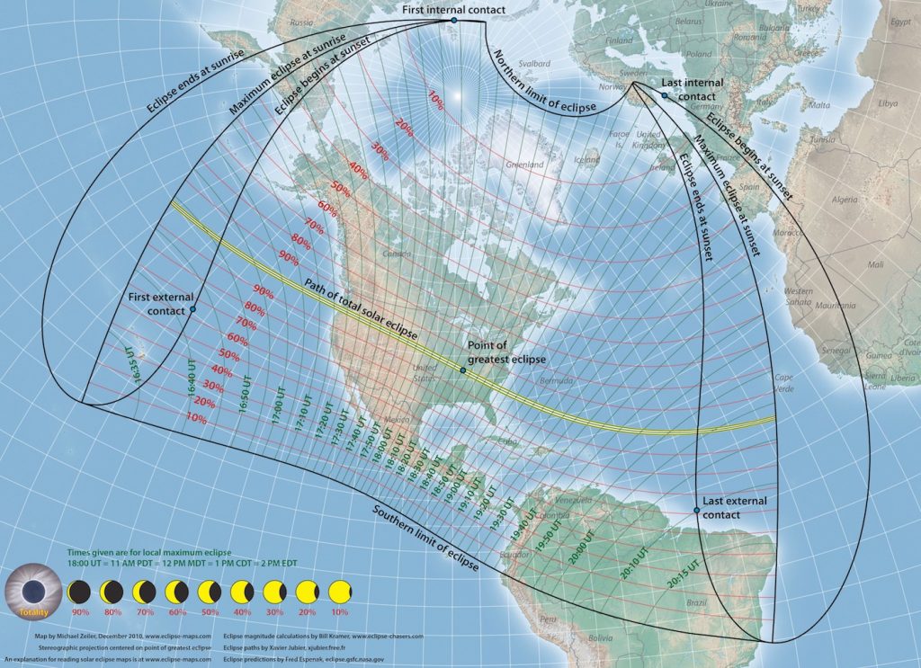 El lunes, 21 de agosto de 2017, se podrá ver un eclipse total de Sol desde de un sendero estrecho que cruzará Estados Unidos. El trayecto de la sombra umbral de la Luna comienza en el Pacífico Norte y cruza a Estados Unidos de oeste a este, en los estados de Oregón, Idaho, Montana, Wyoming, Nebraska, Kansas, Iowa, Missouri, Illinois, Kentucky, Tennessee, Carolina del Norte, Georgia y Carolina del Sur.