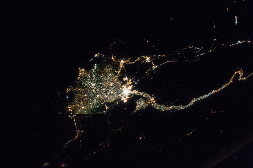 Fotografía tomada desde la Estación Espacial Internacional el 28 de marzo de 2017 a las 00:49 UTC. Se aprecia la ciudad de El Cairo, capital de Egipto, y el río Nilo, el cual se extiende desde la zona derecha. El mar Mediterráneo está ubicado del lado izquierdo. Al momento de tomarse la imagen, la Estación Espacial Internacional se encontraba ubicada sobre el oriente de Egipto.