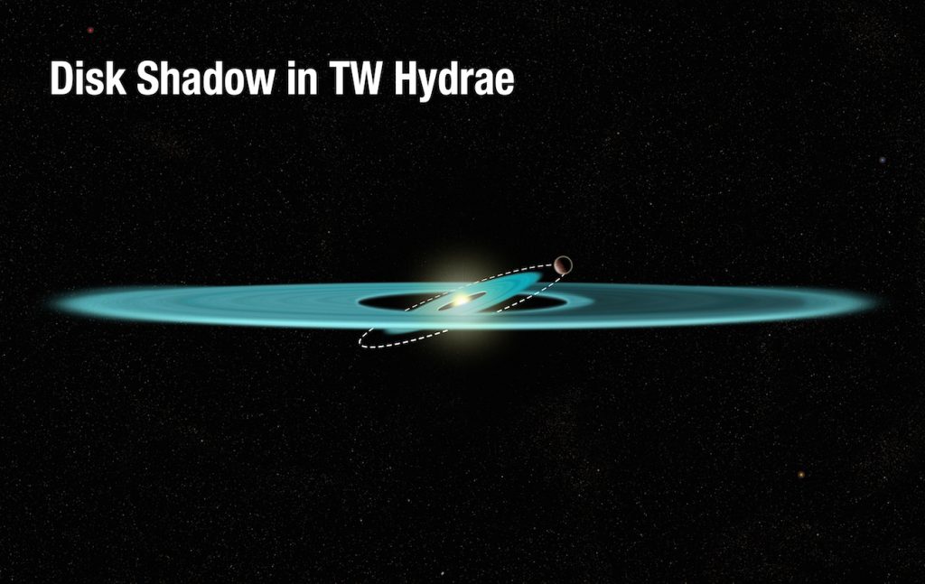 El Telescopio Espacial Hubble ha detectado una enorme sombra recorriendo el disco de polvo alrededor de una estrella cercana. Los astrónomos piensan que la sombra está siendo producida indirectamente por un exoplaneta, al perturbar gravitacionalmente todo el material a su alrededor, creando una deformación e inclinación de la región interna del disco, la cual bloquea la luz de la estrella, proyectado una sombra sobre las regiones externas.