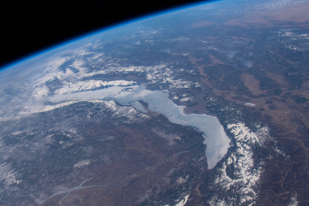 Imagen del Lago Baikal tomada desde la Estación Espacial Internacional el miércoles, 10 de abril de 2019, a las 07:40 UTC. El Lago Baikal está ubicado en la región sur de Siberia, Rusia. Al momento de tomarse la imagen, la ISS se encontraba ubicada sobre el noroeste de Mongolia, cerca de la frontera con Rusia.