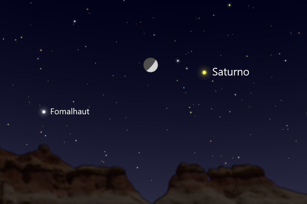 La conjunción de la Luna y el planeta Saturno será visible el martes, 29 de noviembre de 2022, comenzando al anochecer en dirección Sur. La aproximación máxima entre los dos objetos se producirá a las 08:00 UTC. El evento se podrá apreciar a simple vista desde cualquier parte del mundo.