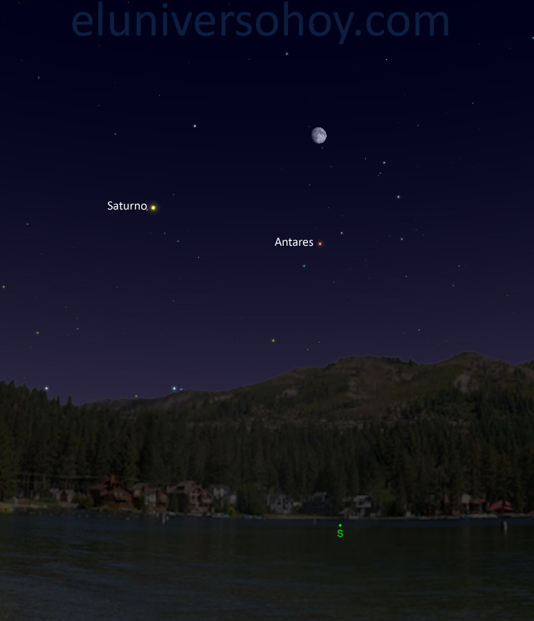 La conjunción de la Luna y Antares — la estrella más brillante de la constelación de Escorpio — será visible el miércoles, 5 de julio de 2017, comenzando en dirección Sur al anochecer. El máximo acercamiento ocurrirá a las 01:00 UTC (día 6). Magnitud de Antares de +1,1. La conjunción se podrá ver desde cualquier país.