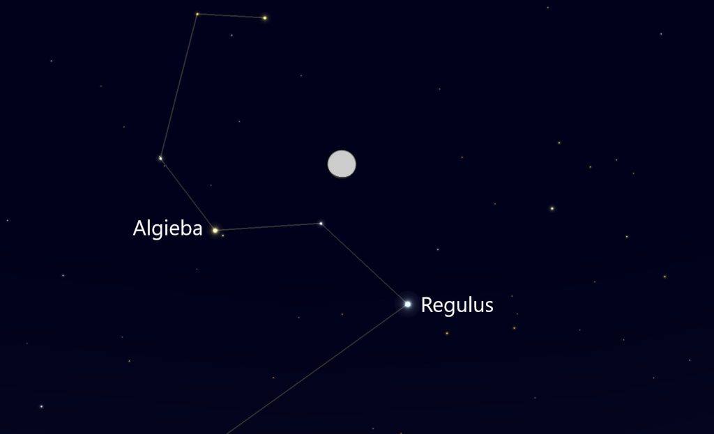 La conjunción de la Luna y la estrella Regulus será visible el martes, 15 de marzo de 2022, comenzando en dirección Sureste al anochecer. La aproximación máxima se producirá a las 06:00 UTC del día 16. El evento se podrá observar desde cualquier parte del mundo a simple vista.