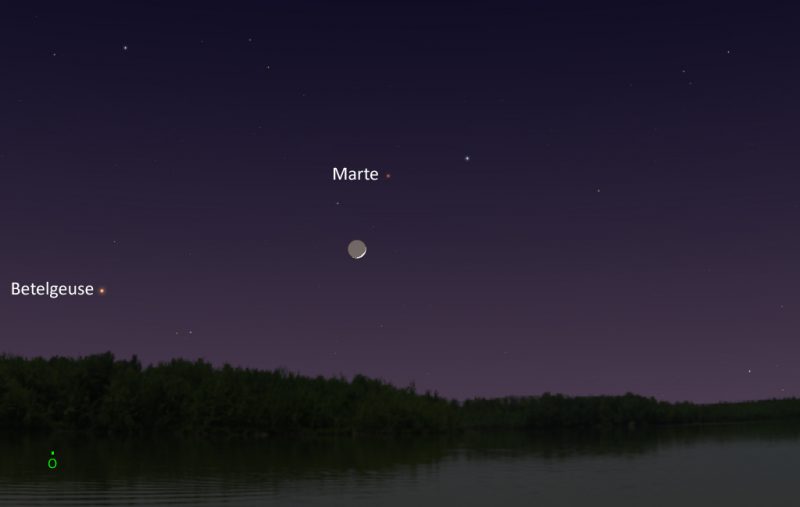 La conjunción de la Luna creciente y Marte será visible este martes, 7 de mayo de 2019, en dirección Oeste al anochecer. La máxima aproximación se producirá a las 01:00 UTC (madrugada del día 8). El evento se podrá observar desde cualquier país.