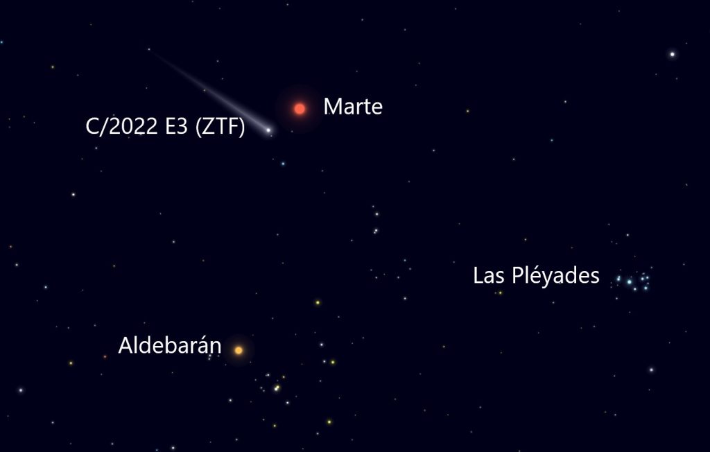 La noche de este sábado, 11 de febrero de 2023, se producirá la aproximación máxima entre el planeta Marte y el Cometa C/2022 E3 (ZFT). Los dos objetos comienzan a ser visibles al anochecer en dirección Sur. Marte brillará con magnitud de 0 (visible a simple vista), mientras que el Cometa C/2022 E3 (ZFT) brillará con magnitud de +6,6 y solamente es visible a través de prismáticos o telescopio.