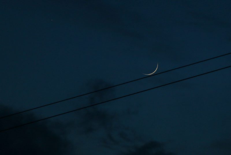 Fotografía de la conjunción de la Luna y la estrella Aldebarán tomada al anochecer del lunes, 6 de mayo de 2019, desde Arenys de Munt, Barcelona, España. El tiempo de exposición es de 1/50 de segundo, 400 de ISO y f/5,6 de apertura. La foto se tomó a las 21:23 (hora local) con una cámara Canon EOS 70D.