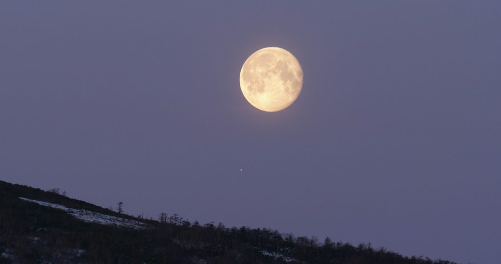 Fotografía de la conjunción de la Luna gibosa menguante y Júpiter tomada la madrugada del martes, 21 de mayo de 2019, desde Magadán, Rusia. Se utilizó una cámara Panasonic DC-GH5 a 201mm de distancia focal; tiene un tiempo de exposición de 1/10 de segundo y 100 de ISO.
