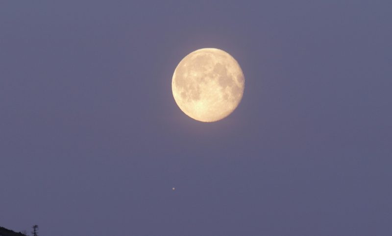 Fotografía de la conjunción de la Luna gibosa menguante y Júpiter tomada la madrugada del martes, 21 de mayo de 2019, desde Magadán, Rusia. Se utilizó una cámara Panasonic DC-GH5 a 201mm de distancia focal; tiene un tiempo de exposición de 1/10 de segundo y 100 de ISO.