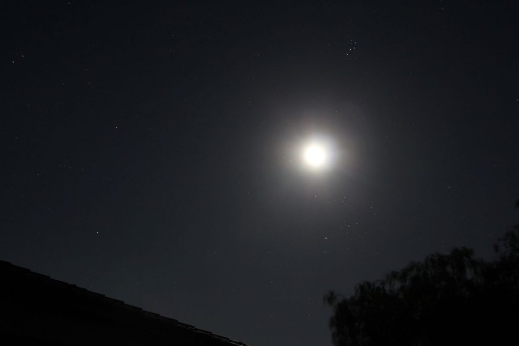 Fotografía de la Luna tomada a las 22:45 (hora local) del 23 de octubre de 2021, desde Arenys de Munt, Barcelona, España. Las Pléyades son visibles arriba de la Luna; la estrella Aldebarán está ubicada abajo.