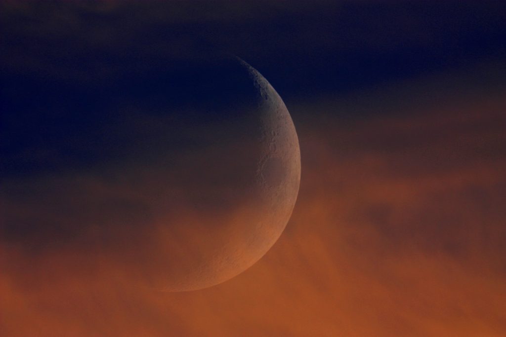 Fotografía de la Luna creciente captada al atardecer del 27 de abril de 2020, desde Arroyo de la Miel en la provincia de Málaga, España. Se utilizó una cámara Canon EOS 450D y un telescopio refractor TMB (152mm). La captura tiene un tiempo de exposición de 1/125 de segundo y 100 de ISO.
