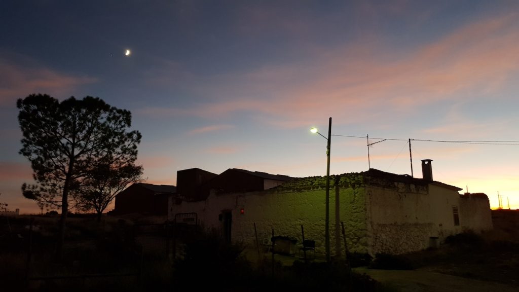 Foto de Júpiter y la Luna tomada al anochecer del jueves, 3 de octubre de 2019, desde Sisante, Cuenca, España. La captura se obtuvo a las 20:17 (hora local) con la cámara de un Samsung Note 8; tiene un tiempo de exposición de 1/13 de segundo y 250 de ISO (f/1,7 de apertura).