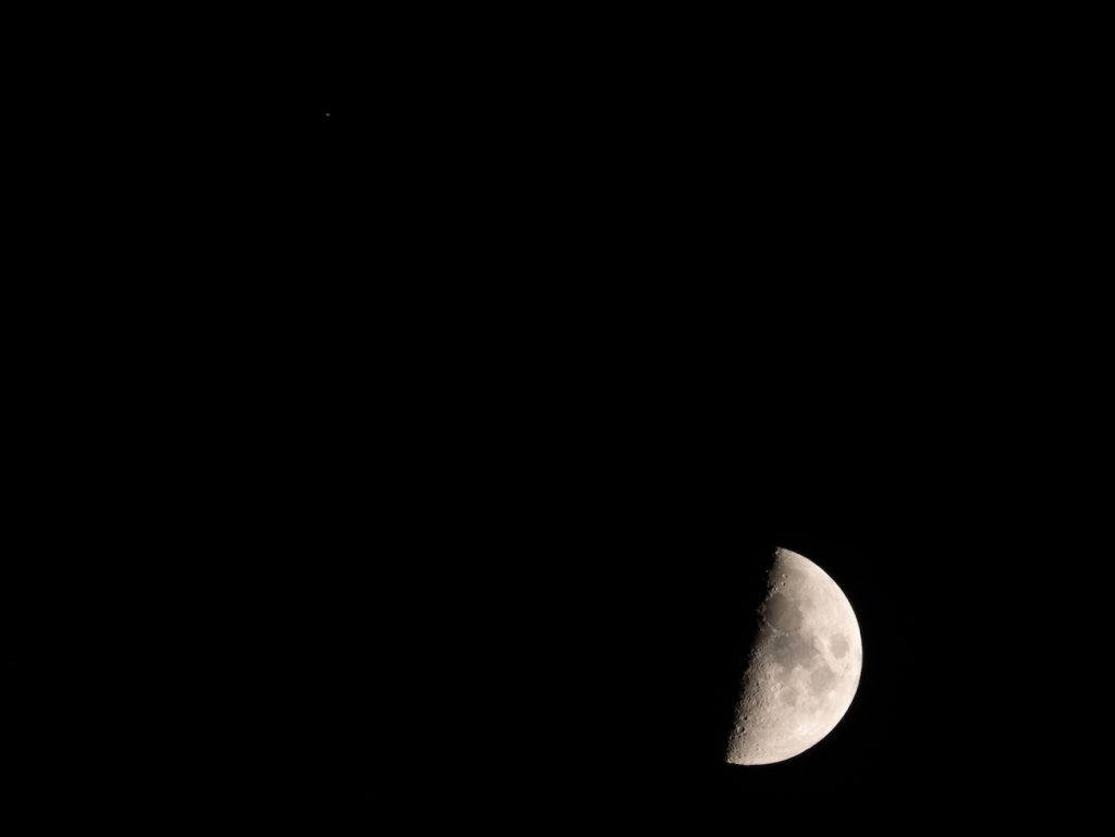Fotografía de la conjunción de la Luna y Saturno tomada la noche del sábado, 5 de octubre de 2019, desde la ciudad de Zaragoza en España. Saturno es apenas visible en la zona superior-izquierda. La imagen es una sola exposición obtenida con una cámara Panasonic Lumix GX80 y un objetivo Panasonic Lumix (100-300mm).