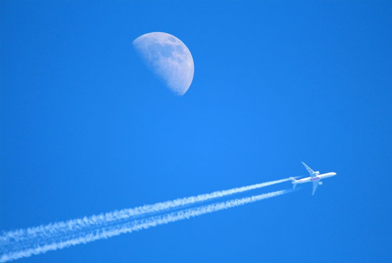 Fotografía de la Luna y un avión tomada la tarde del sábado, 13 de abril de 2019, desde la ciudad de Arenys de Munt, provincia de Barcelona, España. La imagen fue hecha a las 19:20 (hora local) con una cámara Canon EOS 650D a 1/640 de segundo, 400 de ISO y f/5,6 de apertura.