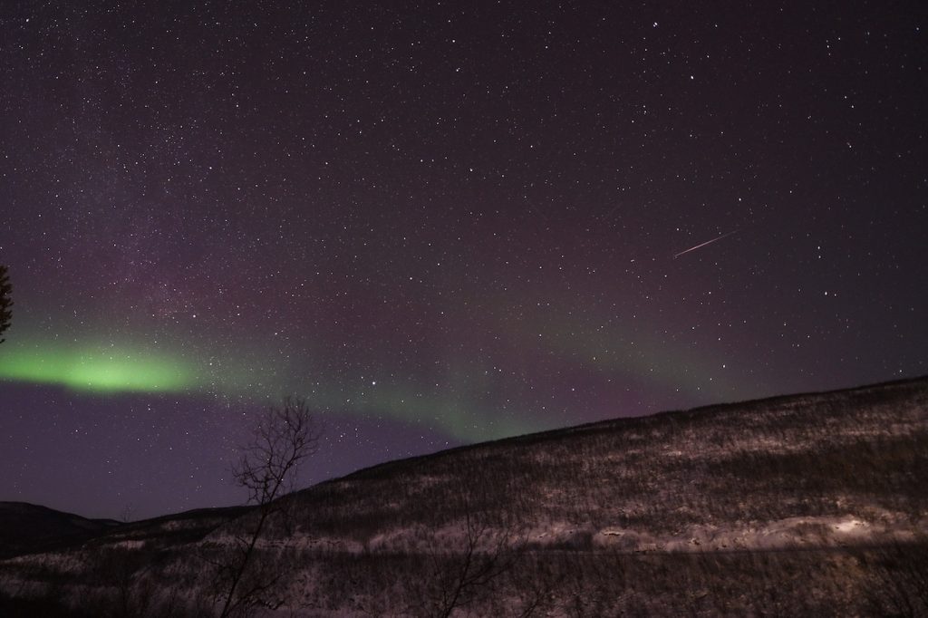 Auroras boreales fotografiadas desde Utsjoki, Finlandia, la noche del 11 de marzo de 2019. En la zona central-derecha se puede ver un meteoro. La imagen tiene un tiempo de exposición de 15 segundos, 2000 de ISO y f/2,8 de apertura; se utilizó una cámara Nikon D750.