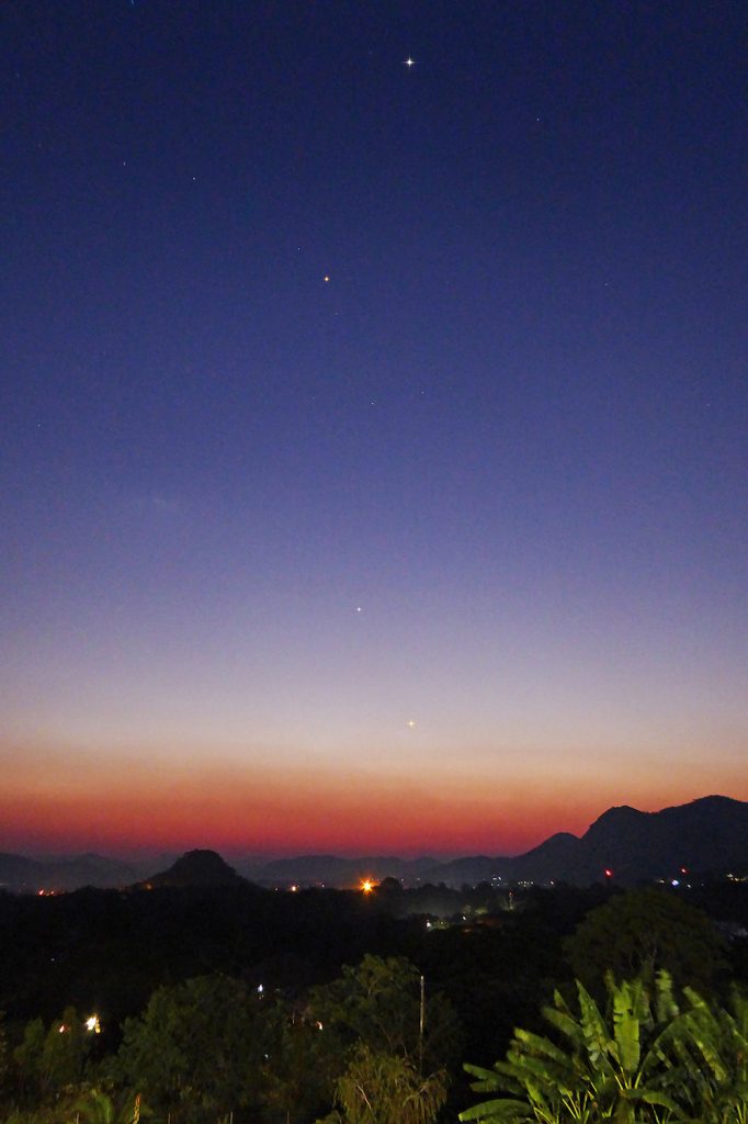 Imagen tomada al atardecer del sábado, 19 de octubre de 2019, desde Mutare, Zimbabue. Cerca del horizonte se pueden ver los planetas Venus (el más brillante) y Mercurio. En la zona superior se puede ver a Júpiter (cerca del borde de la imagen) y la estrella Antares.