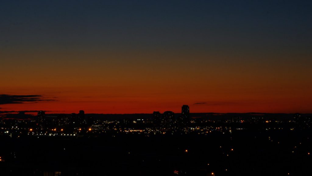 Fotografía del atardecer tomada el 28 de septiembre de 2019, desde la ciudad de Toronto, Canadá. Se utilizó una cámara Sony ILCE-6000; la captura tiene un tiempo de exposición de 5 segundos y 100 de ISO (68mm de distancia focal y f/20 de apertura).