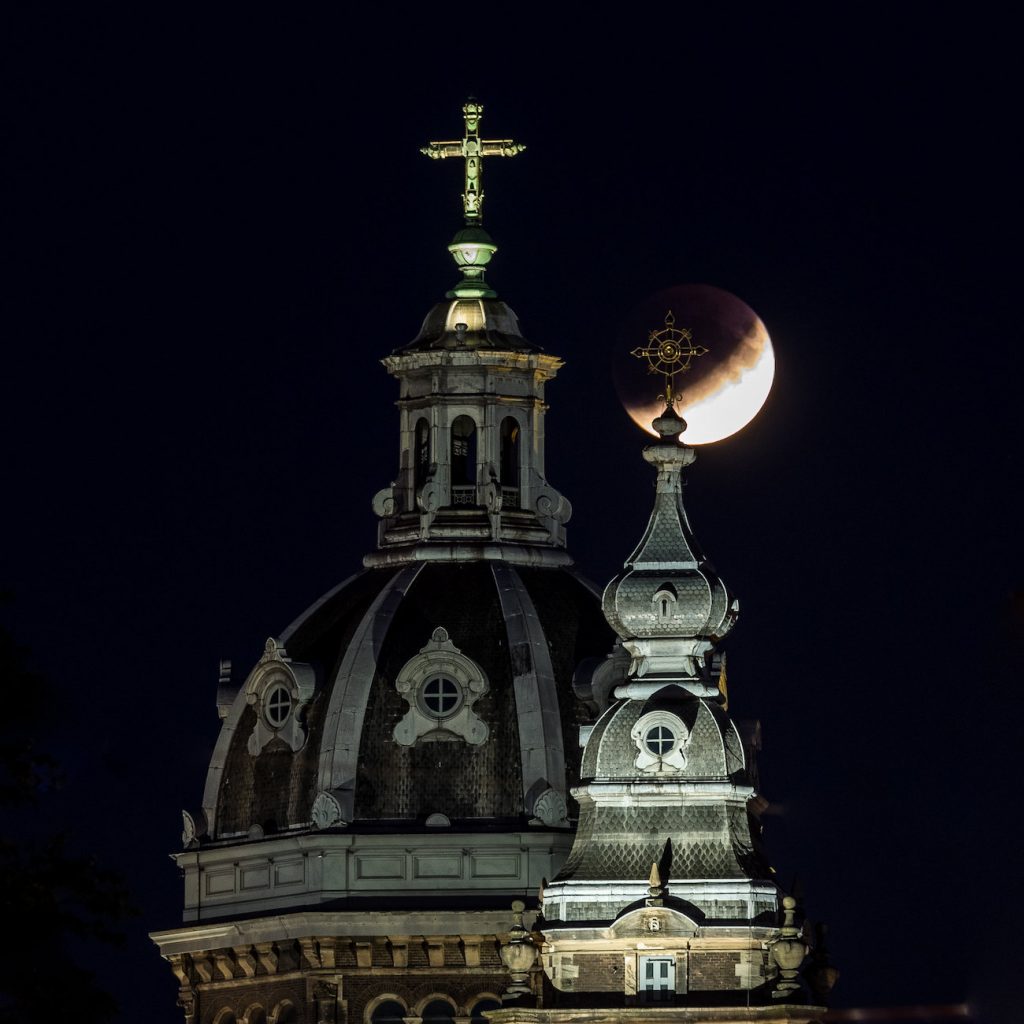 Imagen del eclipse parcial de Luna tomada la noche del 16 de julio de 2019, desde la ciudad de Ámsterdam, Países Bajos. En primer plano se puede ver la Basílica de San Nicolás. Se utilizó una cámara Olympus E-M1 a 210mm de distancia focal; la captura tiene 200 de ISO y 1 segundo de tiempo de exposición (f/5,6).