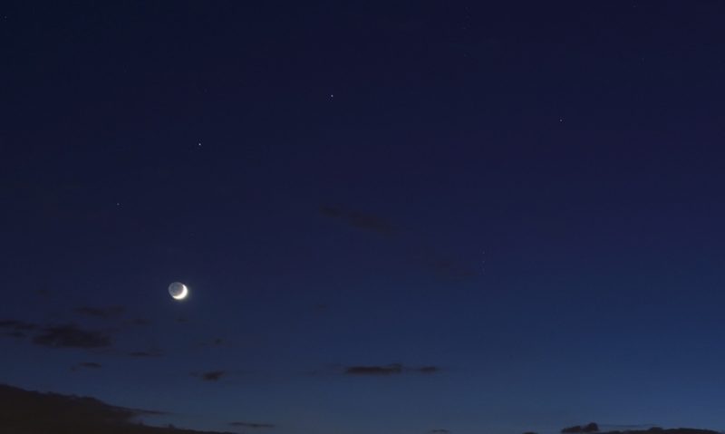 Fotografía de la Luna creciente tomada la noche del martes, 7 de mayo de 2019, desde Toruń en Polonia. Arriba de la Luna se puede ver a Marte y la estrella Elnath. La foto se tomó con una cámara Nikon D850 a 5 segundos de tiempo de exposición, 320 de ISO y f/8 de apertura.