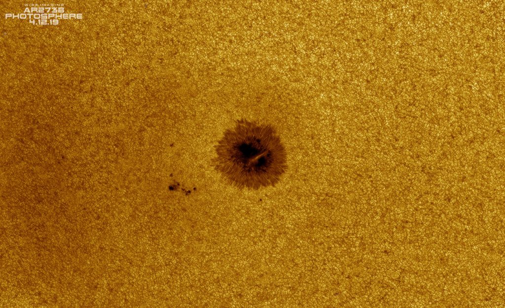 Espectacular fotografía de la región activa 2738 en el Sol, captada la tarde del viernes, 12 de abril de 2019, desde la ciudad de Trenton en el estado de Florida, Estados Unidos. La región activa 2738 se encuentra actualmente en el centro del disco solar; es fácilmente visible a través de cualquier telescopio solar.