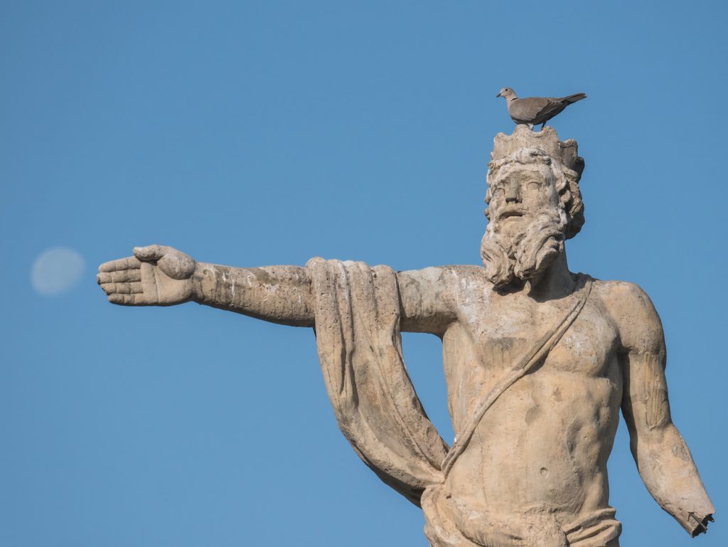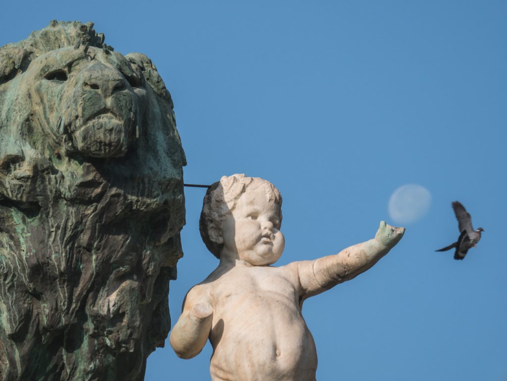 Fotografías de la Luna gibosa menguante tomadas la mañana del domingo, 21 de julio de 2019, desde el Parque Grande José Antonio Labordeta, Zaragoza, España. En las dos primeras imágenes se puede ver el monumento a Basilio Paraíso con el león zaragozano flanqueado por dos robustos angelotes que representan a la industria y al comercio. En la última imagen se ve la fuente de Neptuno.